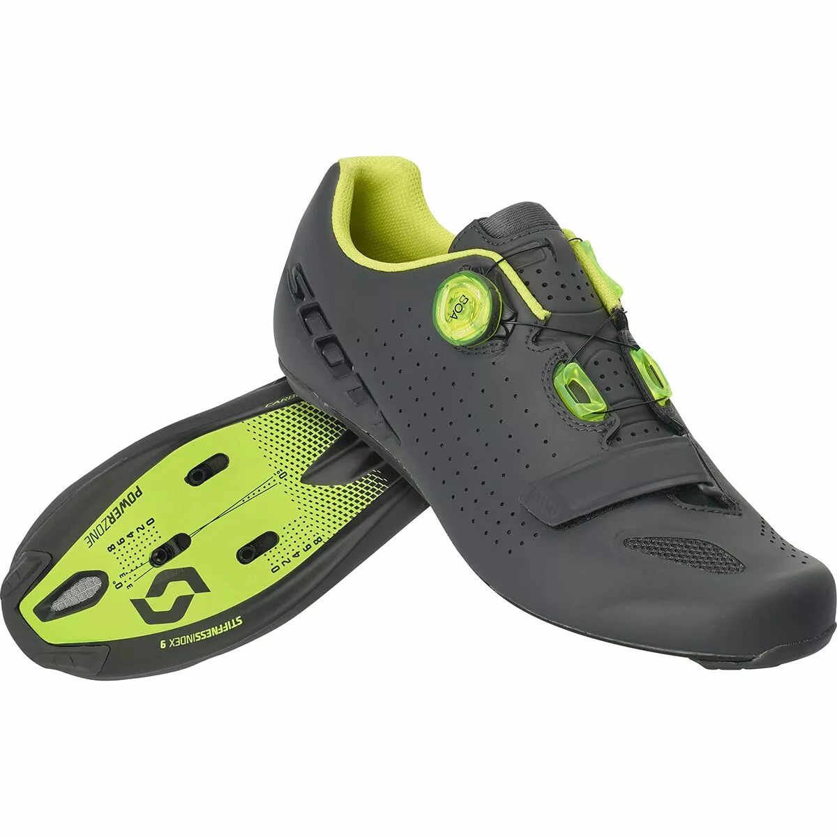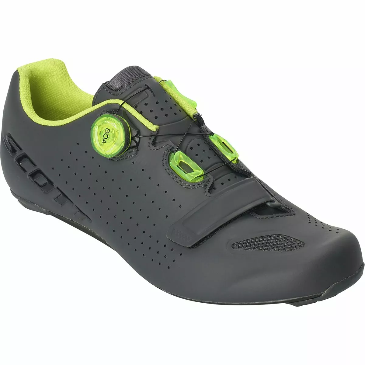For the Road Vertec Boa, Scott employs a single Boa IP-1 dial that precisely controls the upper, so it can wrap your foot like a glove with micro-adjustments. This single Boa dial is complemented with a lower hook-and-loop strap, which secures over your forefoot to keep it secure under power. Not only is this upper incredibly fast and convenient to secure tightly, but it allows you a greater degree of adjustability than you’d find with a comparable shoe using only straps and buckles. On the underside of the foot, the high-modulus carbon fiber sole optimizes stiffness in the cleat area, yet still allows some torsional flex from the arch to the heel in order to minimize strain on the knee and ankle.